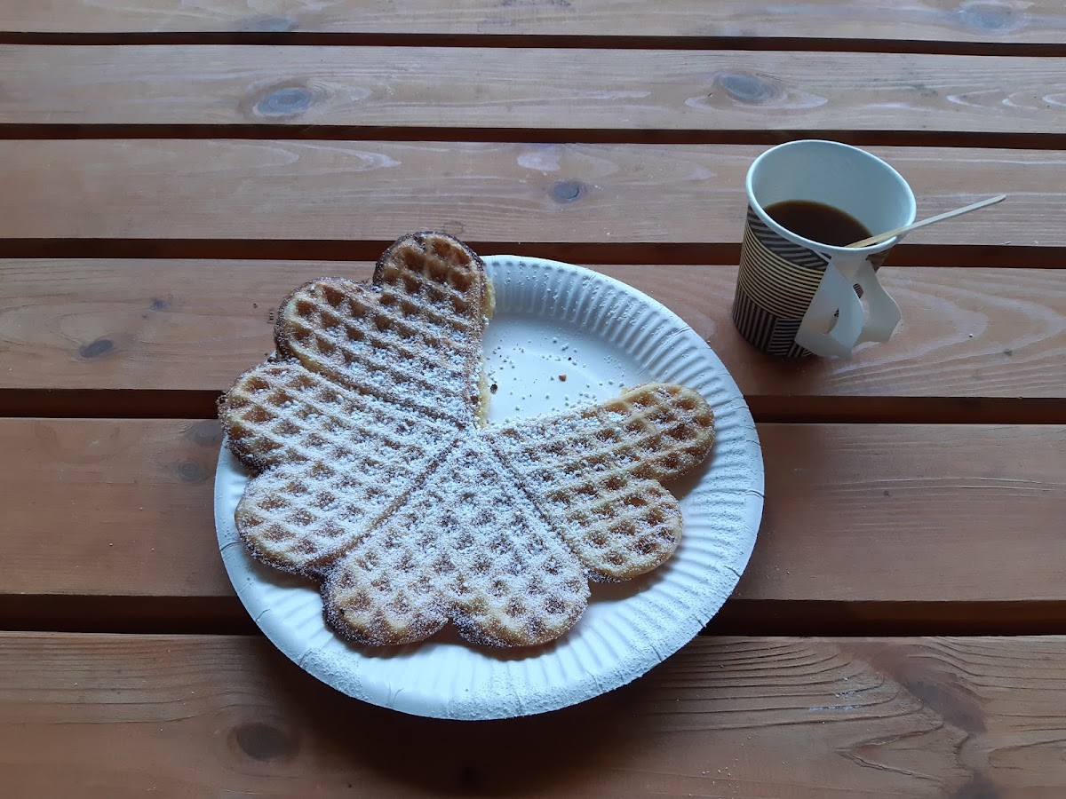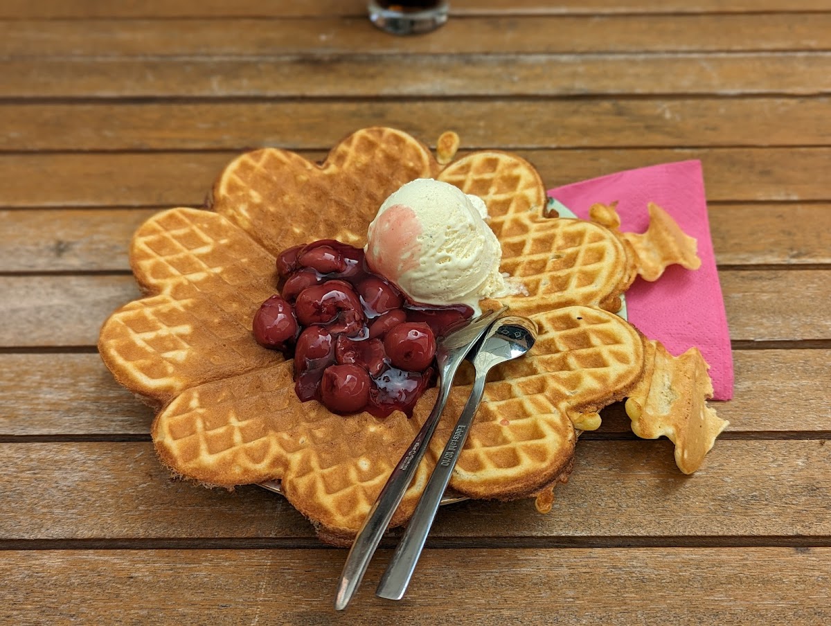 The vibe here leans towards casual and unpretentious. Visitors help themselves at the counter, which adds a relaxed, self-service rhythm to the experience. The menu highlights freshly made waffles, often served with warm cherries and cream or vanilla ice cream, alongside a selection of home-baked cakes like mandarinen-sahne-torte and erdbeertorte. This focus on fresh and homemade sweet treats, paired with coffee classics including eiskaffee topped with vanilla ice cream, makes it an easy choice for a laid-back coffee break or afternoon indulgence.